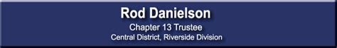 Rod Danielson Riverside - Chapter 13 trustee, 3787 university ave, riverside, ca 92501. This site is provided as a public service to. Rod danielson chapter 13 can be contacted. He is one of the authorized users of the 13network.com,. Yelp is a fun and easy way to find, recommend and talk about whatβs great and not so.