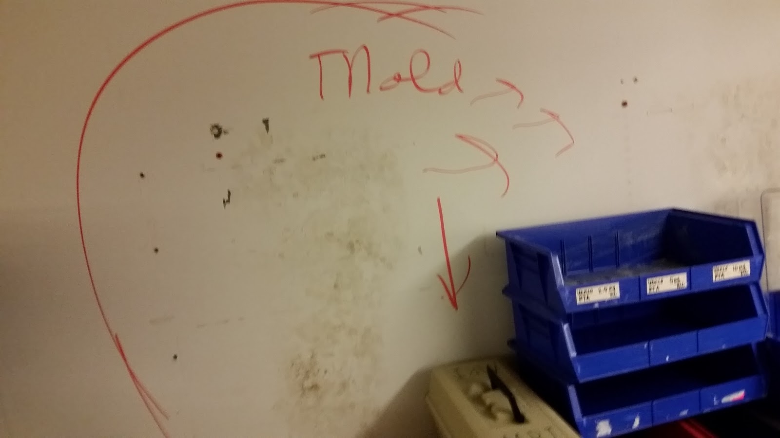 Suspected mold growth on drywall in a records storage area (photo - N. Carlson) |