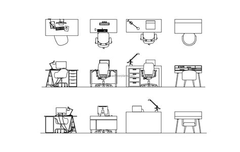 Office desks, chairs and other furniture in plan and elevation view. The following is a file that contains a block usable for cutting, which deals with a study table or desk for an office or room. These dwg models created in autocad 2004.