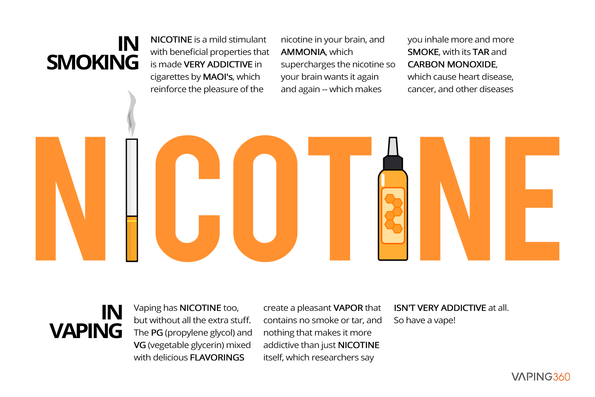 Using e-cigarettes, referred to as vaping, works by heating a liquid to generate an aerosol that the user inhales. The liquid in the e-cigarette, called e-liquid, is usually made up of propylene glycol, glycerin, flavorings, water, and nicotine, although some users will substitute thc for nicotine. In practice, e-cigarette users tend to reach lower blood nicotine concentrations than tobacco smokers, although it is difficult to make a direct comparison because nicotine concentrations in e-cigarettes vary widely. Reasons individuals vape include the following: smoking cessation the thought that vaping is less harmful than cigarettes circumvention of smoke-free areas recreational enjoyment (1).