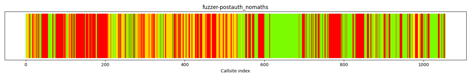 The calltree shows the control flow of the fuzzer. This is overlaid with coverage information to display how much of the potential code a fuzzer can reach is in fact covered at runtime. In the following there is a link to a detailed calltree visualisation as well as a bitmap showing a high-level view of the calltree. For further information about these topics please see the glossary for full calltree and calltree overview