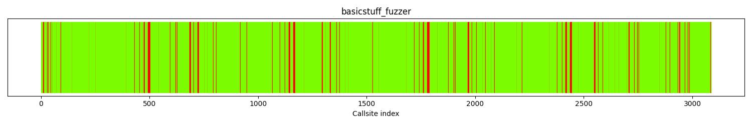 The calltree shows the control flow of the fuzzer. This is overlaid with coverage information to display how much of the potential code a fuzzer can reach is in fact covered at runtime. In the following there is a link to a detailed calltree visualisation as well as a bitmap showing a high-level view of the calltree. For further information about these topics please see the glossary for full calltree and calltree overview