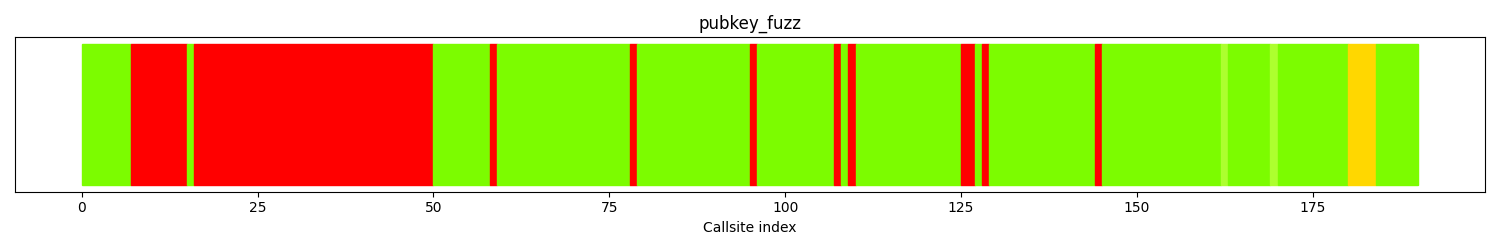 The calltree shows the control flow of the fuzzer. This is overlaid with coverage information to display how much of the potential code a fuzzer can reach is in fact covered at runtime. In the following there is a link to a detailed calltree visualisation as well as a bitmap showing a high-level view of the calltree. For further information about these topics please see the glossary for full calltree and calltree overview