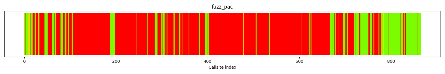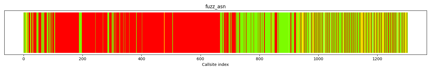 The calltree shows the control flow of the fuzzer. This is overlaid with coverage information to display how much of the potential code a fuzzer can reach is in fact covered at runtime. In the following there is a link to a detailed calltree visualisation as well as a bitmap showing a high-level view of the calltree. For further information about these topics please see the glossary for full calltree and calltree overview