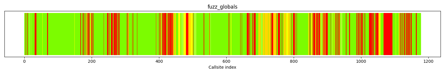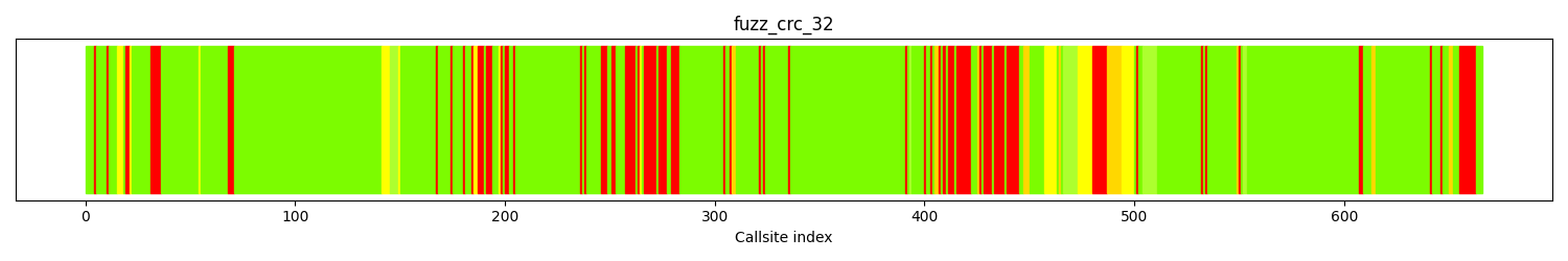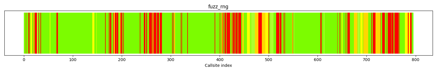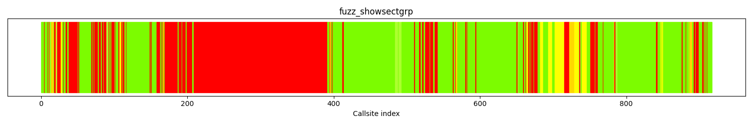 The calltree shows the control flow of the fuzzer. This is overlaid with coverage information to display how much of the potential code a fuzzer can reach is in fact covered at runtime. In the following there is a link to a detailed calltree visualisation as well as a bitmap showing a high-level view of the calltree. For further information about these topics please see the glossary for full calltree and calltree overview