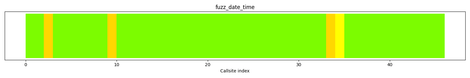 The calltree shows the control flow of the fuzzer. This is overlaid with coverage information to display how much of the potential code a fuzzer can reach is in fact covered at runtime. In the following there is a link to a detailed calltree visualisation as well as a bitmap showing a high-level view of the calltree. For further information about these topics please see the glossary for full calltree and calltree overview