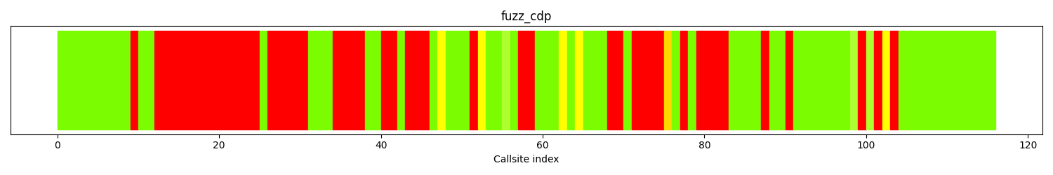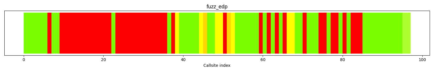The calltree shows the control flow of the fuzzer. This is overlaid with coverage information to display how much of the potential code a fuzzer can reach is in fact covered at runtime. In the following there is a link to a detailed calltree visualisation as well as a bitmap showing a high-level view of the calltree. For further information about these topics please see the glossary for full calltree and calltree overview
