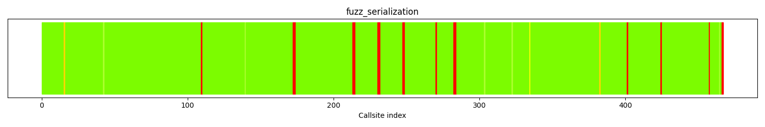 The calltree shows the control flow of the fuzzer. This is overlaid with coverage information to display how much of the potential code a fuzzer can reach is in fact covered at runtime. In the following there is a link to a detailed calltree visualisation as well as a bitmap showing a high-level view of the calltree. For further information about these topics please see the glossary for full calltree and calltree overview