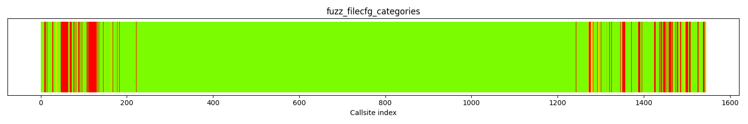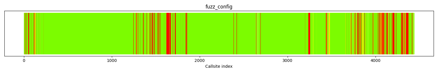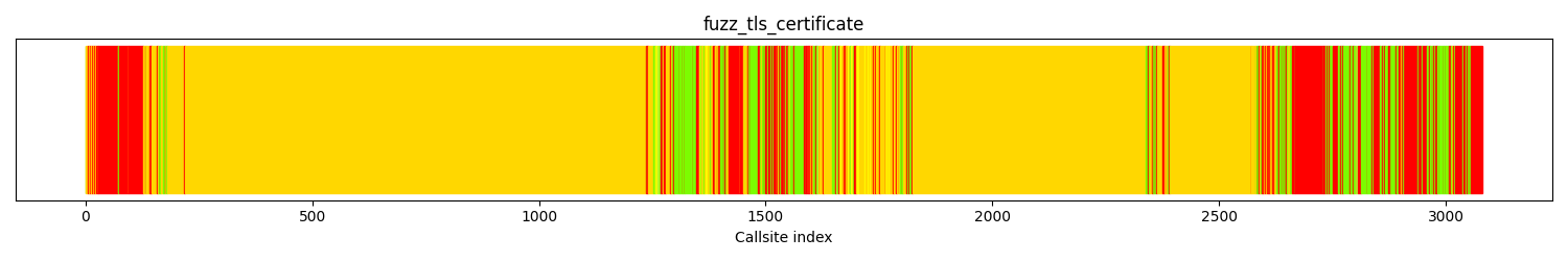 The calltree shows the control flow of the fuzzer. This is overlaid with coverage information to display how much of the potential code a fuzzer can reach is in fact covered at runtime. In the following there is a link to a detailed calltree visualisation as well as a bitmap showing a high-level view of the calltree. For further information about these topics please see the glossary for full calltree and calltree overview