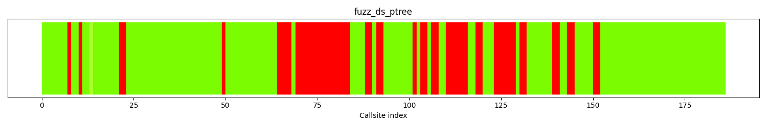 The calltree shows the control flow of the fuzzer. This is overlaid with coverage information to display how much of the potential code a fuzzer can reach is in fact covered at runtime. In the following there is a link to a detailed calltree visualisation as well as a bitmap showing a high-level view of the calltree. For further information about these topics please see the glossary for full calltree and calltree overview