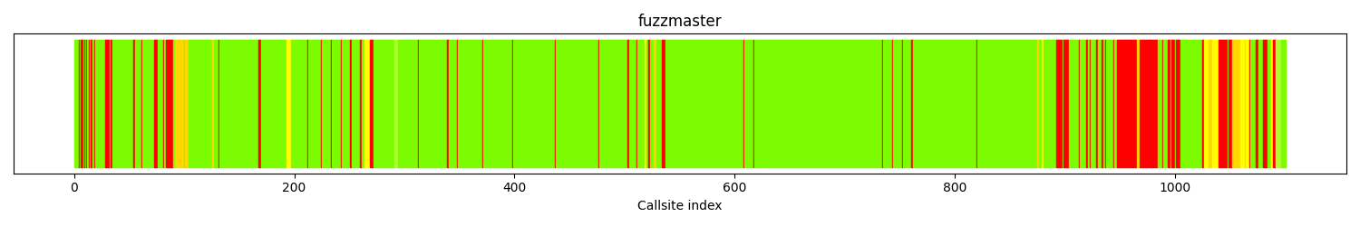 The calltree shows the control flow of the fuzzer. This is overlaid with coverage information to display how much of the potential code a fuzzer can reach is in fact covered at runtime. In the following there is a link to a detailed calltree visualisation as well as a bitmap showing a high-level view of the calltree. For further information about these topics please see the glossary for full calltree and calltree overview