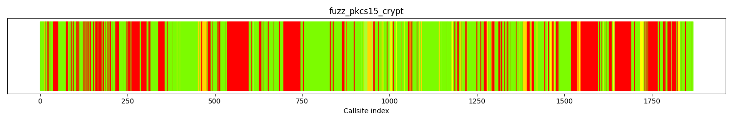 The calltree shows the control flow of the fuzzer. This is overlaid with coverage information to display how much of the potential code a fuzzer can reach is in fact covered at runtime. In the following there is a link to a detailed calltree visualisation as well as a bitmap showing a high-level view of the calltree. For further information about these topics please see the glossary for full calltree and calltree overview