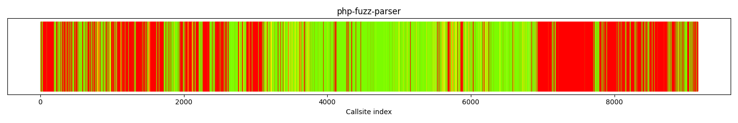The calltree shows the control flow of the fuzzer. This is overlaid with coverage information to display how much of the potential code a fuzzer can reach is in fact covered at runtime. In the following there is a link to a detailed calltree visualisation as well as a bitmap showing a high-level view of the calltree. For further information about these topics please see the glossary for full calltree and calltree overview