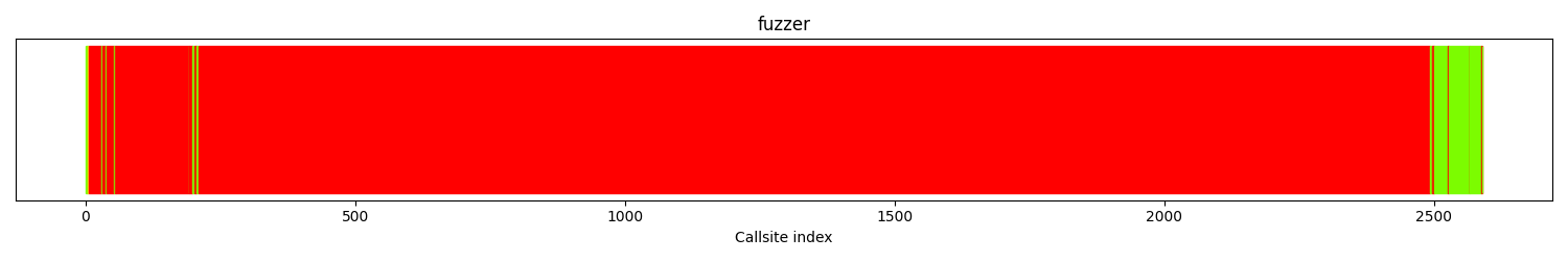 The calltree shows the control flow of the fuzzer. This is overlaid with coverage information to display how much of the potential code a fuzzer can reach is in fact covered at runtime. In the following there is a link to a detailed calltree visualisation as well as a bitmap showing a high-level view of the calltree. For further information about these topics please see the glossary for full calltree and calltree overview