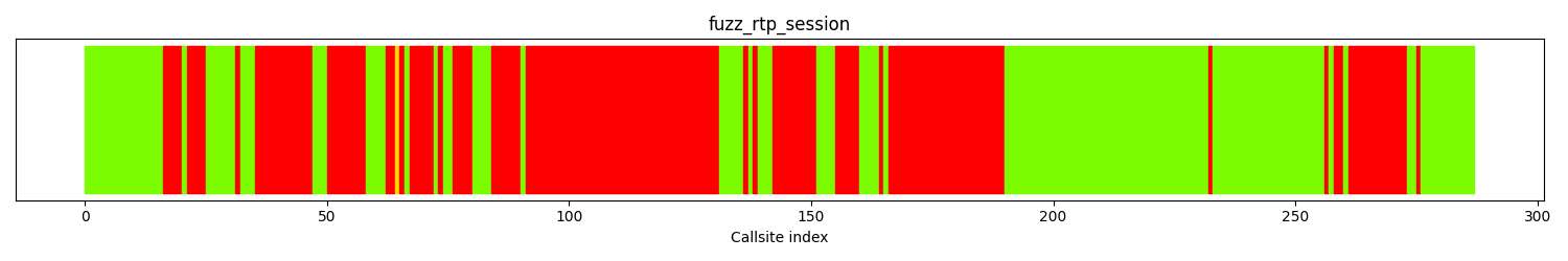 The calltree shows the control flow of the fuzzer. This is overlaid with coverage information to display how much of the potential code a fuzzer can reach is in fact covered at runtime. In the following there is a link to a detailed calltree visualisation as well as a bitmap showing a high-level view of the calltree. For further information about these topics please see the glossary for full calltree and calltree overview