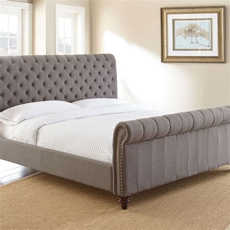 Swanson Queen Bed - Designed for both beauty and durability, the swanson upholstered bed is constructed with solid wood turned feet. Upholstered sleigh bed available in king or queen sizes styling details include tufted rolled headboard and footboard panel with nailhead trim and solid wood turned feet Relax in comfort with the elegant swanson upholstered bed featuring a tufted headboard with nail head accents..