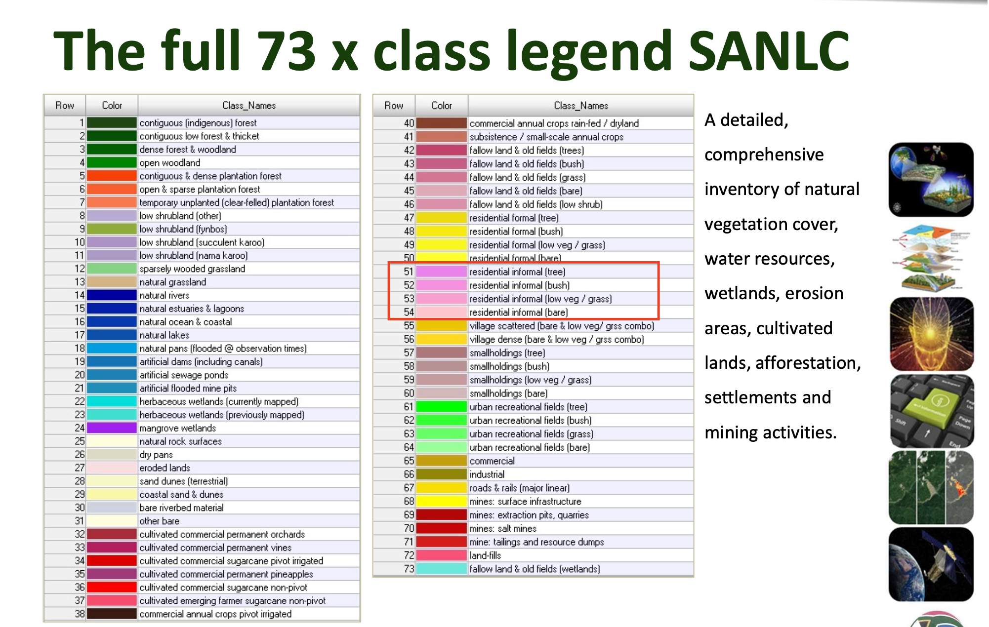 SANLC 2018 Presentation, which can be downloaded from the EGIS Portal. For this exercise, we are interested in the informal settlements represented by class numbers 51 through 54.