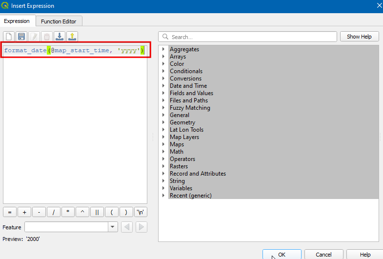 Insert an Expressionbutton and enter the following expression to display the year. Here the variable@map_start_timecontains the timestamp of the current time slice being displayed. So we can use that timestamp and format it to display year of occurrence. See the QGIS Documentation for details on various supported formatting options for the timestamp.