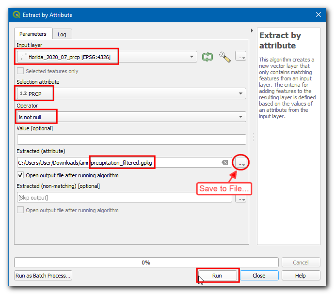 florida_2020_07_prcp, then choosePRCPin Selection attribute, thenis not nullin Operator. Click on the…next to Extracted (attribute), choose Save to File…, enter the layer name asprecipitation_filtered.gpkgand click Run.