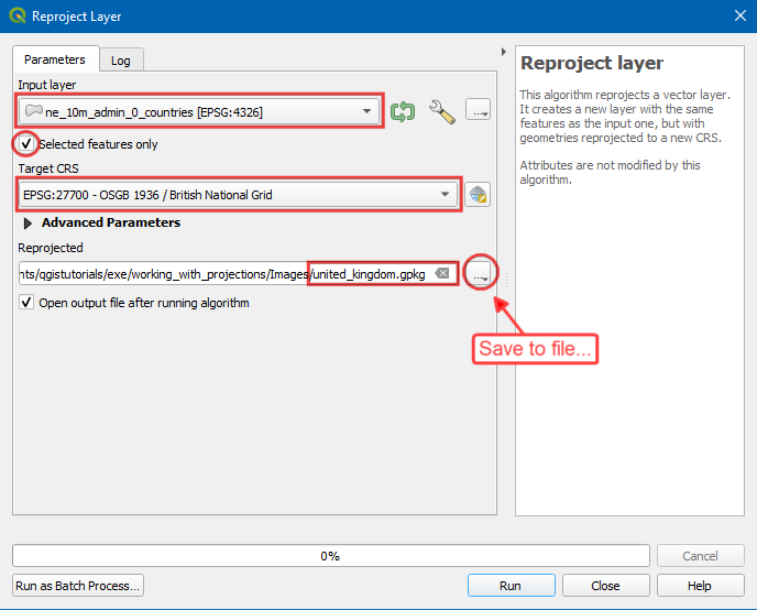 ne_10m_admin_0_countriesas the Input layer, check Selected features only then click on the globe icon next to Target CRS, search and selectEPSG:27700 - OSGB 1936 / British National Grid. In Reprojected, choose the...and click Save to a file. Now choose the directory and enter the name asunited_kingdom.gkpgand click Run.