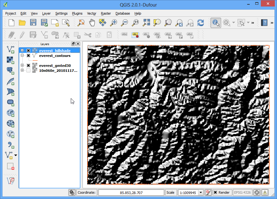 Once the process finishes, you will see a new layer loaded in QGIS. This layer covers only the area around Mt. Everest.Now we are ready to generate contours. Select the contour tool from .