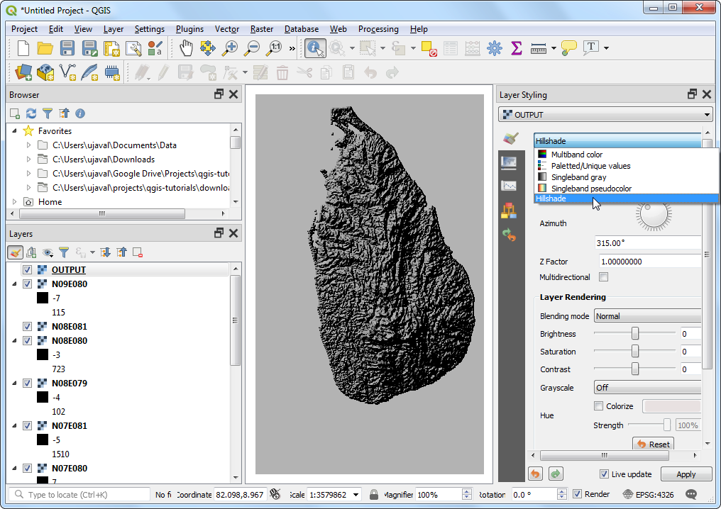 Using the Hillshade renderer to visualize elevation data.