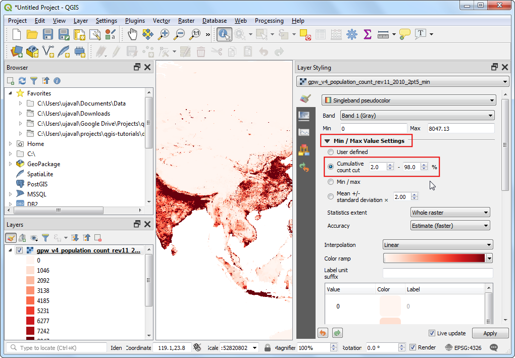 Cumulative count cutoption. You will see that the map visualization is much better now. The standard data range is set from 2% to 98% of the data values, meaning that the outliers will not be used to set the minimum and maximum values, resulting in a much more representative visualization.