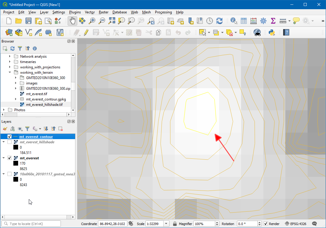 Switch to the main QGIS window. You will see the selected contour line highlighted in yellow. This is the area of the highest elevation in our dataset.