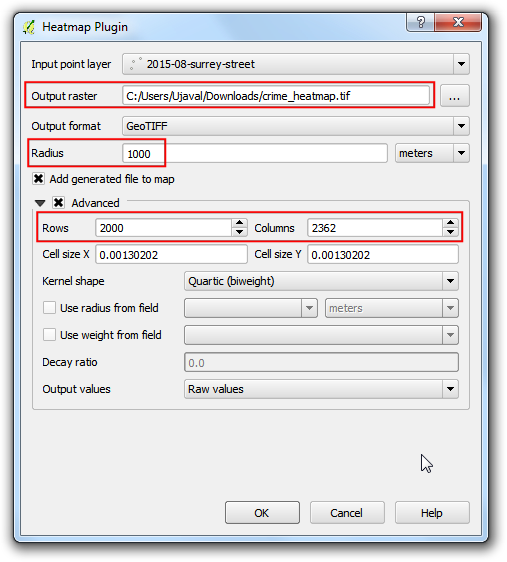 crime_heatmapas the name out the Output raster. Enter 1000 meters as the Radius. Radius is the area around each point that will be used to calculate the i`heat` a pixel received. Check the Advanced so we can specify the output size of our heatmap. Enter2000as Rows value. The Columns value will update automatically. Click OK to start the heatmap creation process.