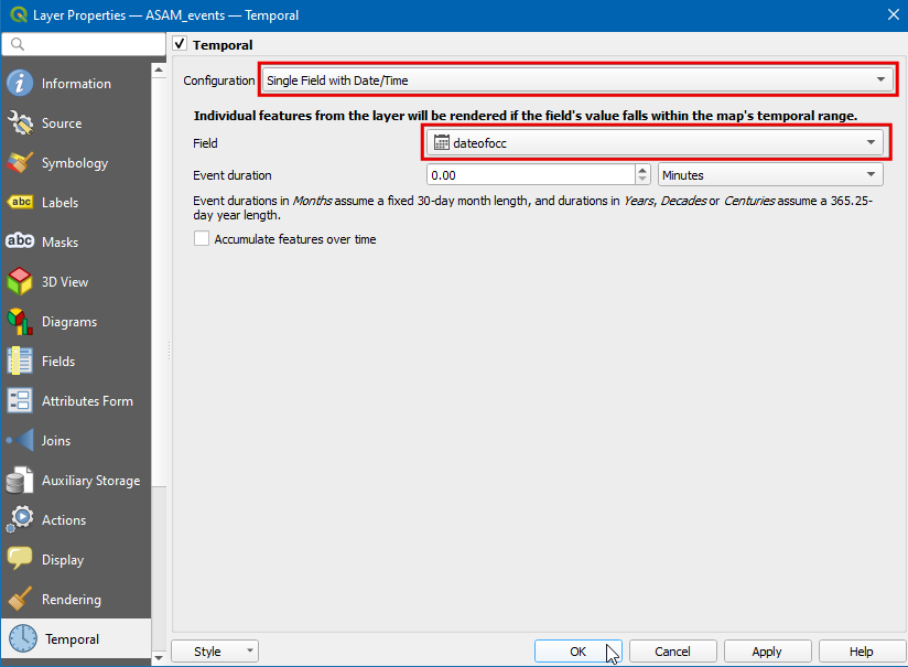 In the Layer properties dialog box, select the Temporal tab and enable it by clicking the checkbox..