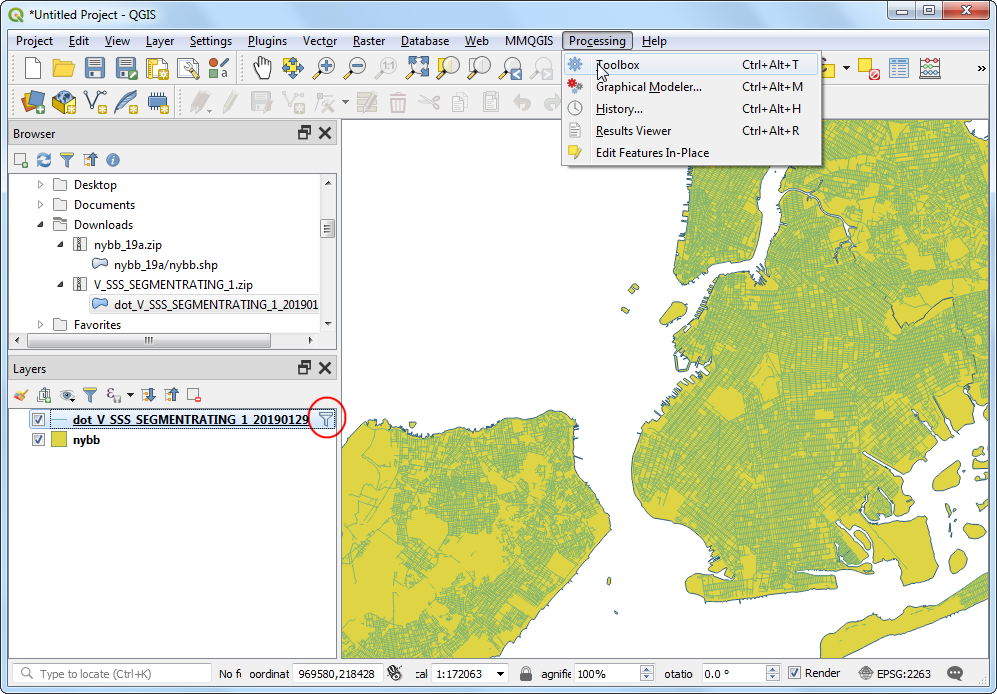 nybb_19a.zipfile in the QGIS Browser and expand it. Select thenybb_19a/nybb.shplayer and drag it to the canvas. This is a polygon layer representing the borough boundaries in New York city.