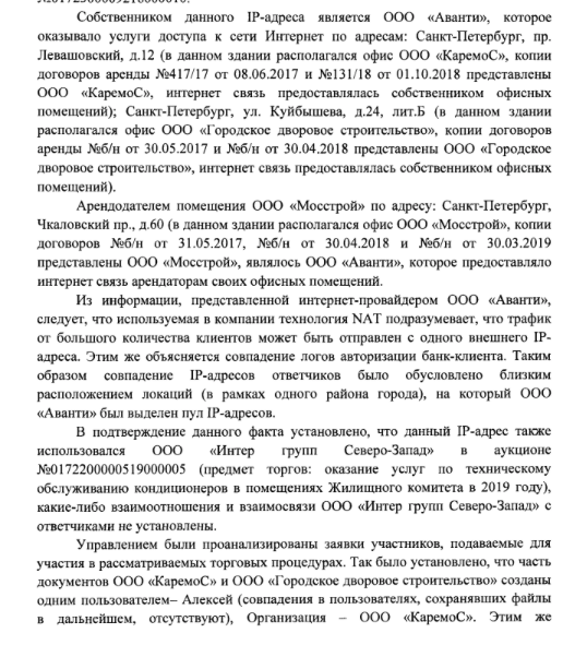 Дальше — больше. Оказалось, что в целом ряде случаев компании «подавали заявки, ценовые предложения и подписывали контракты, получали доступ к электронным почтовым ящикам с одних IP-адресов». Но и этому, казалось бы, железобетонному доводу мгновенно нашлось оправдание.