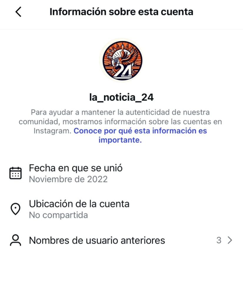 - La cuenta desinformadora @la_noticia_24en Instagram, cuenta con 267 mil seguidores, se hace pasar por un noticiero, fue creada en noviembre de 2022 y ha cambiado de nombre al menos tres veces.