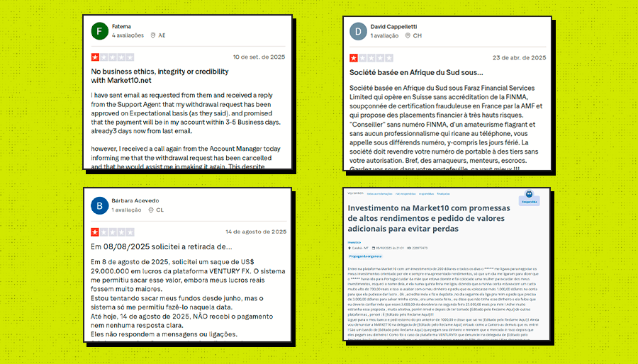 El abordaje coincide con otras pruebas realizadas por Lupa: en todos los casos, tras el registro, hubo llamadas presionando para realizar inversiones inmediatas. La experiencia también fue relatada en más de veinte testimonios de usuarios en Reclame Aqui, en la plataforma Trustpilot y en X sobre Market10 y VenturyFX. Las quejas señalan presión constante para invertir sumas iniciales y promesas de altos rendimientos. Las denuncias fueron registradas en al menos siete países: Argentina, Brasil, Chile, Uruguay, México, Emiratos Árabes Unidos y Suiza.