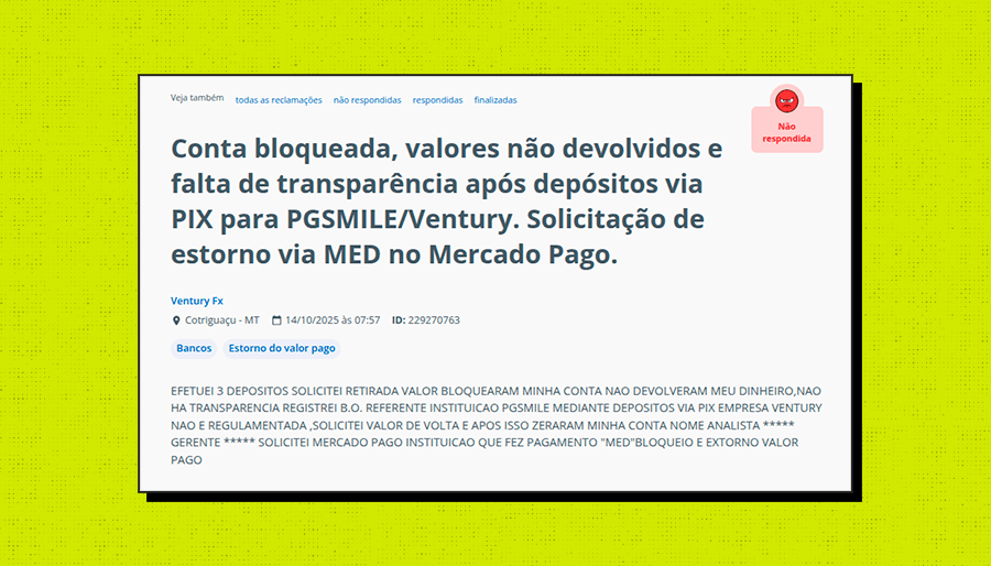 En uno de los casos investigados por el reportaje, otro inversionista del estado de Mato Grosso cuenta que hizo tres depósitos vía Pix para VenturyFX y que, después de solicitar el retiro del valor invertido, su cuenta fue bloqueada.
