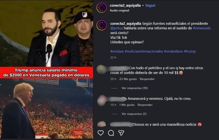 Dicho usuario se describe como un “medio comunicacional (prensa virtual)” y dice ser manejado por la licenciada Ivanny Mora, y aunque suele crear contenido propio con noticias auténticas como la exigencia de Rusia sobre la liberación inmediata de Nicolás Maduro, no verificó la veracidad del supuesto sueldo mínimo de 2 mil dólares, la cual publicó nuevamente este 26 de enero de 2026 en otra adaptación que incluye en la portada al presidente salvadoreño, Nayib Bukele, afirmando que “según fuentes extraoficiales el presidente @potus [usuario de Instagram de Donald Trump] hablaría sobre una reforma en el sueldo de #venezuela”.