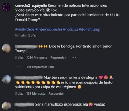 La otra versión fue difundida ese mismo día en Instagram por la cuenta @conecta2_aquiyalla, y aunque advierte que fue un video extraído de TikTok y deja la incógnita “¿Será cierto este ofrecimiento por parte del Presidente de EEUU Donald Trump?”, el vídeo ha sido reposteado más de 3.700 veces y ha recibido comentarios de usuarios compartiendo su alegría por esta iniciativa, atribuyéndole credibilidad.