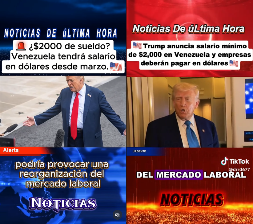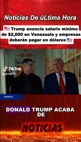 “El presidente Donald Trump acaba de anunciar una medida que podría transformar por completo la vida de los venezolanos (…)”, especificando el supuesto aumento del salario mínimo a partir del mes de marzo y la obligación de las empresas a pagar en dólares, con el objetivo de “restaurar el poder adquisitivo y poner fin a años de salarios erosionados”. Asimismo, afirma que “fuentes cercanas a la implementación afirman que los jubilados pasarán a recibir unos 500, también en dólares con pagos directos y sin conversiones inestables”.
