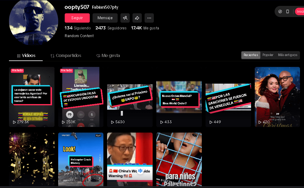 El perfil de TikTok tiene sólo 10 vídeos, siendo el primero publicado el 4 de octubre de 2025, y se describe como “Random Content” (que se traduce en español como contenido cualquiera o aleatorio). Además, puede verse el nombre Fabián y un vídeo generado con Inteligencia Artificial en el que desea Feliz Año Nuevo.