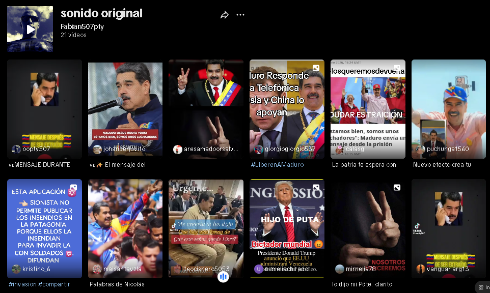 Pocos días después de la captura de Nicolás Maduro y de Cilia Flores en Caracas por parte del equipo Delta Force del Ejército de Estados Unidos, surgieron diversas falsificaciones sintéticas de su captura, que se viralizaron, pero Cocuyo Chequea también detectó un audio que circuló en algunas cuentas oficiales desprevenidas y que tiene como fuente una poco conocida cuenta en TikTok.