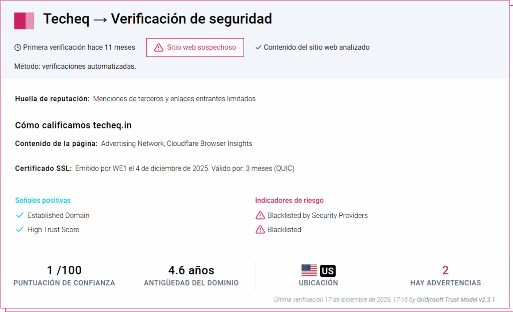 Al investigar sobre el dominio web, llamado Techeq.in, este se ubica en una “zona peligrosa”, según Gridinsoft, una compañía de software especializada en antivirus. Tomando en cuenta su último análisis, realizado el 17 de diciembre de 2025, este sitio se ubica en “la lista negra de proveedores de seguridad”, obteniendo un puntaje de confianza de 1/100, es decir, no tiene confiabilidad alguna, a pesar de que es un dominio que tiene 4 años y medio de antigüedad.