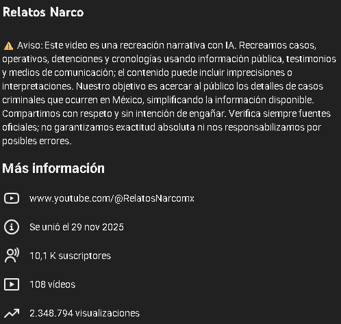 El vídeo está alojado en un canal de Youtube llamado Relatos Narco MX, creado recientemente, el 29 de noviembre de 2025, con la siguiente descripción: