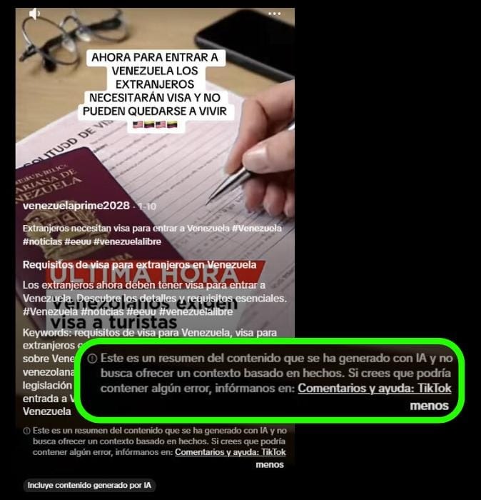 El audiovisual fue difundido por una cuenta de TikTok que reconoce producir contenidos generados con inteligencia artificial y que mantiene un patrón de publicaciones con escenarios ficticios sobre la “Venezuela del mañana”, incluidos otros materiales previamente desmentidos. La pieza no cita fuentes oficiales ni presenta respaldo documental que sustente la supuesta medida migratoria.