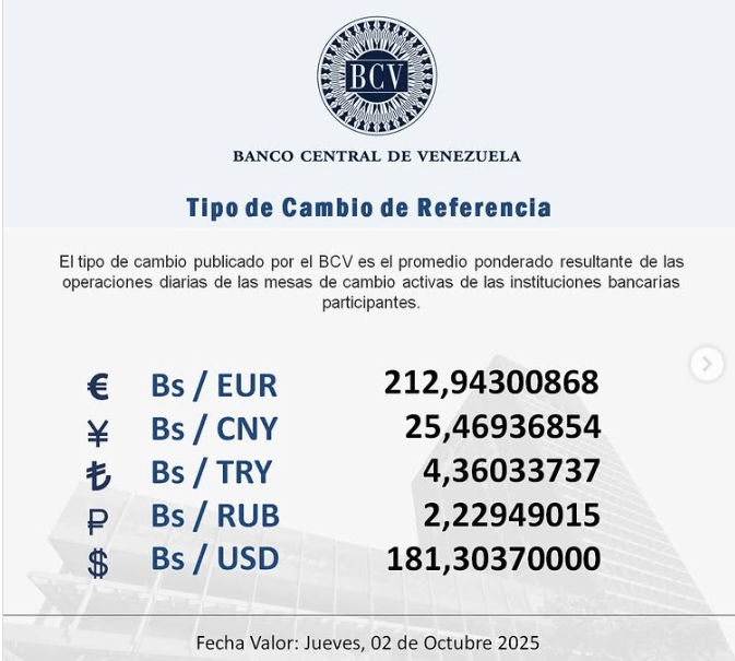 El BCV destaca que el tipo de cambio publicado por el BCV es el promedio ponderado de las operaciones de las instituciones bancarias del país, al cierre de la jornada del miércoles 1 de octubre de 2025.
