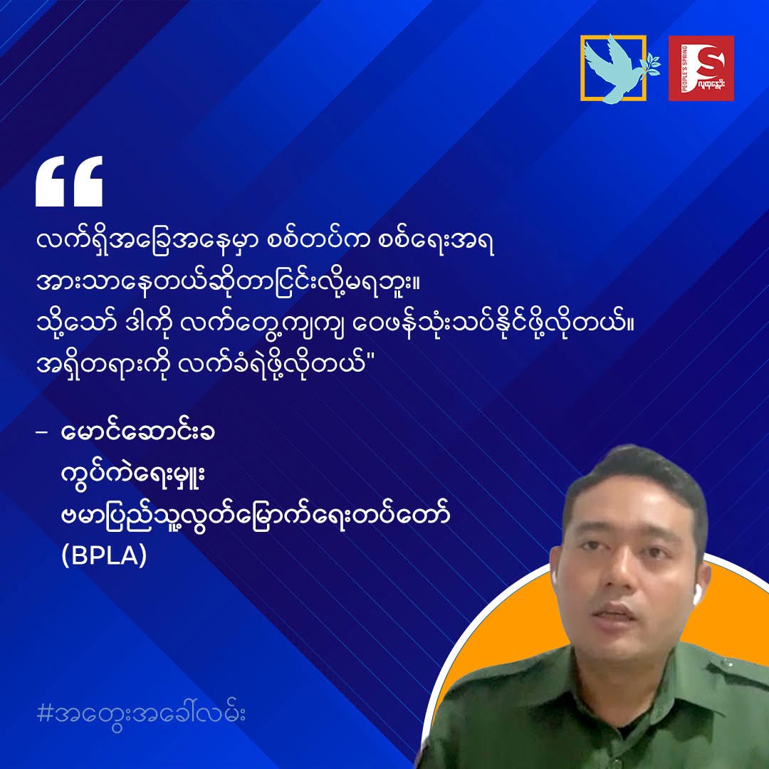 People’s Goal နဲ့ People’s Spring တို့ကစီစဥ်တဲ့ “ ၂၀၂၆ ကိုမျှော်ရည်ခြင်း-တော်လှန်လူငယ်များရဲ့ မာန်နဲ့အသံ” ဆိုတဲ့စကားဝိုင်းဆွေးနွေးချက်တွေထဲကနေ ဗမာပြည်သူ့လွတ်မြောက်ရေးတပ်တော် (BPLA)ကွပ်ကဲရေးမှူး မောင်ဆောင်းခရဲ့ ဆွေးနွေးချက်အချို့ကို ပြန်လည်ကောက်နှုတ် တင်ဆက်လိုက်ပါတယ်။