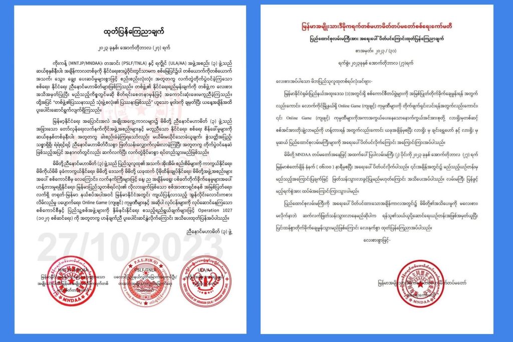ယနေ့ နံနက်တွင် မြောက်ပိုင်းမဟာမိတ် ၃ ဖွဲ့က ထုတ်ပြန်ချက်တစ်စောင်ထုတ်ခဲ့ရာ နယ်စပ်ဒေသများ ထိန်းချုပ်နိုင်ရေး၊ အွန်လိုင်း လောင်းကစားများပပျောက်ရေး၊ ထိုလုပ်ငန်းများကို လုပ်ဆောင်နေသော စစ်ကောင်စီနှင့် ပြည်သူ့စစ်များကို နှိမ်နင်းရေး ဆောင်ရွက်သွားမည်ဖြစ်ကြောင်း ပါရှိသည်။