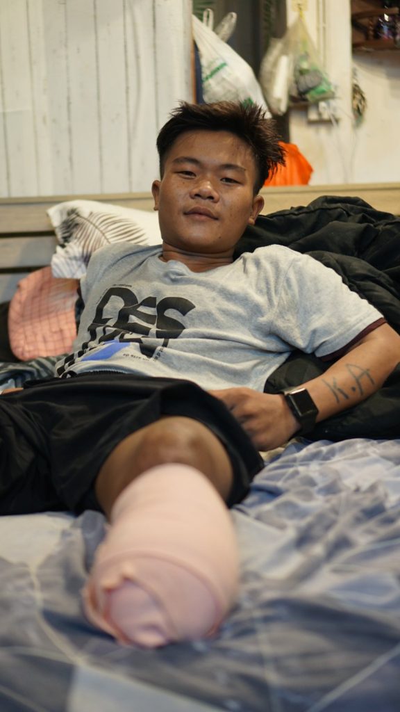 ယခုအခါ ကျည်ထိထားသည့် ခြေထောက် အကြောသေနေပြီး ချိုင်းထောက်အားကိုးဖြင့် လမ်းလျှောက်နေရသည်။