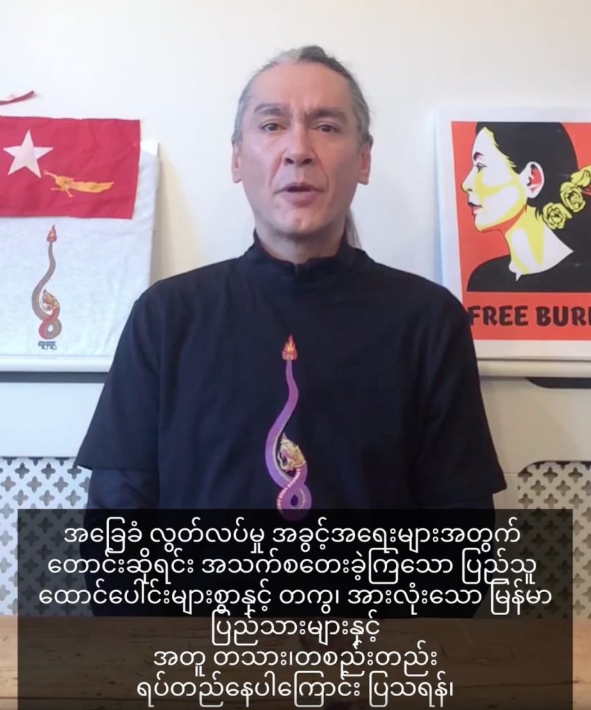 “အခြေခံလွတ်လပ်မှု အခွင့်အရေးများအတွက် တောင်းဆိုရင်း အသက်စတေးခဲ့ကြတဲ့ ပြည်သူထောင်ပေါင်းများစွာနဲ့တကွ အားလုံးသော မြန်မာပြည်သားများနဲ့အတူ တစ်သားတည်း ရပ်တည်နေကြောင်း ပြသဖို့ ကျွန်တော် မြန်မာ့ရေနဂါးပုံ ဆေးမင်ကြောင်ထိုးမယ့်အကြောင်း အသိပေးလိုပါတယ်” ဟု Kim က ပြောသည်။