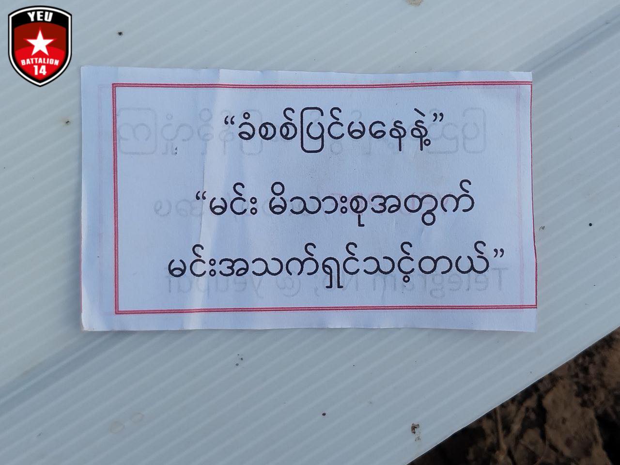 စစ်ကောင်စီတပ်သားများ အလင်းဝင်ရောက်ရန် တိုက်တွန်းထားသည့် စာရွက်များကို ရွှေဘိုခရိုင်တပ်ရင်း-၁၄ က ရေဦးမြို့ထဲသို့ နိုဝင်ဘာလ ၁၀ ရက်တွင် ဒရုန်းဖြင့် ကြဲချထားသည်။