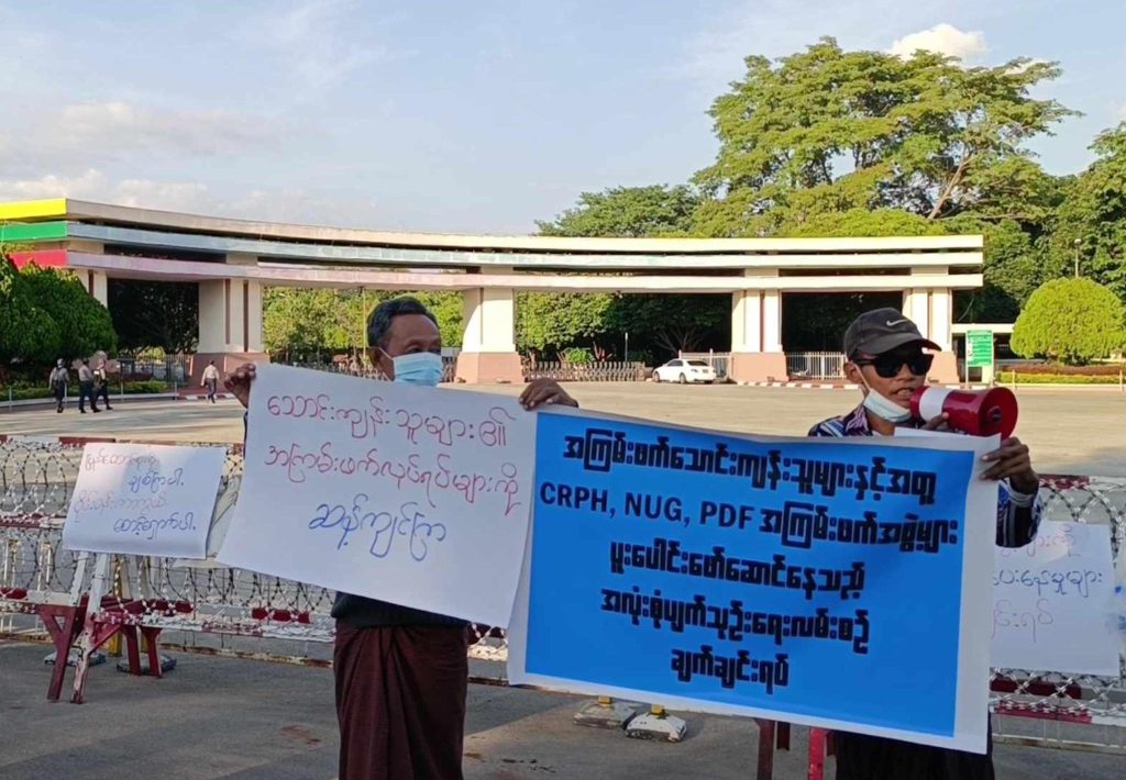 မြန်မာ့အမျိုးသားရေးကွန်ရက်ဟု အမည်ပေးထားသည့် လူတစ်ဒါဇင်ခန့်သည် ယမန်နေ့ (ဒီဇင်ဘာ ၄) ညနေပိုင်းက စစ်ကောင်စီရုံးထိုင်ရာ နေပြည်တော် ပျဉ်းမနား-တောင်ညိုလမ်းမထက်တွင် ၁၀၂၇ စစ်ဆင်ရေးအပါအဝင် မြန်မာ့အရေးတွင် ခြေရှုပ်နေကြသူများမှာ ‘အနောက်နိုင်ငံများ’ ဖြစ်ကြောင်း ဆိုင်းဘုတ်များကိုင်ဆောင်ပြီး ဆန္ဒပြခဲ့ကြသည်။